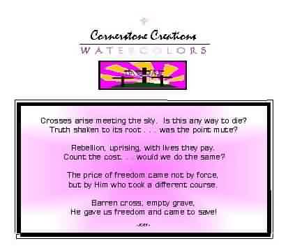 CROSSES ARISE TO MEET THE SKY. IS THIS ANY WAY TO DIE? TRUTH SHAKEN TO ITS ROOT; WAS THE POINT MUTE? REBELLION, UPRISING, WITH LIVES THEY PAY. COUNT THE COST . . .WOULD WE DO THE SAME? THE PRICE OF FREEDOM CAME NOT BY FORCE, BUT BY HIM WHO TOOK A DIFFERENT COURSE. BARREN CROSS, EMPTY GRAVE, HE GAVE US FREEDOM AND CAME TO SAVE!