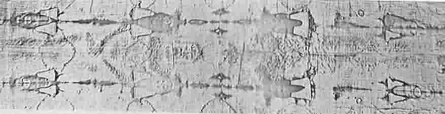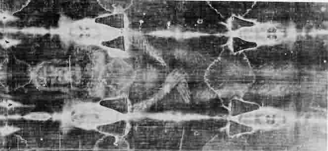 The overwhelming similarities of Jesus' death and the man on the cloth are: HIS EYES WERE COVERED WITH COINS OF CAESAR'S IMAGE OF THE FIRST CENTURY PERIOD. THIS MAN WAS NAILED TO THE CROSS IN THE HANDS AND FEET. A SPEAR WOUND WAS IN HIS SIDE, SCOURGE MARKS WERE ON BOTH FRONT AND BACK OF HIS BODY, WOUND MARKS ON HIS HEAD FROM A CROWN OF THORNS, PARTS OF HIS BEARD WERE PULLED OUT AND BRUISE MARKS WERE ON HIS FACE AND ALSO ON HIS KNEE FROM WHEN HE FELL CARRYING THE CROSS. HE DIED FROM ASPHYXIATION DUE TO CRUCIFIXION AND HIS LEGS WERE NOT BROKEN. THERE HAVE BEEN EXTENSIVE TESTS DONE ON THIS CLOTH WHICH GIVE US MANY MORE SIMILARITIES. WE KNOW THIS ANCIENT BURIAL CLOTH TODAY AS . . . .