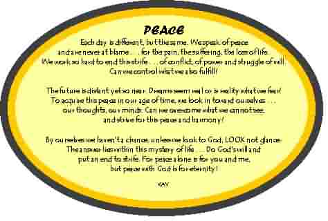 Each day is different, but the same. We speak of peace, but are never at blame . . . for the pain, the suffering, the loss of life. We work so hard to end this strife . . . of conflict, of power and struggle of wills. Can we control what we also fulfill? The future is distant, yet so near. Dreams seem real, or is reality our fear? To acquire this peace in our age of time, we look in toward ourselves . . . our thoughts, our minds. Can we overcome what we cannot see, and strive for this peace and harmony? By ourselves we haven't a chance, unless we look to God, LOOK not glance. The answer lies within this mystery of life. . . Do God's will and put an end to strife. Peace alone is for you and me, but peace with God is for all eternity!