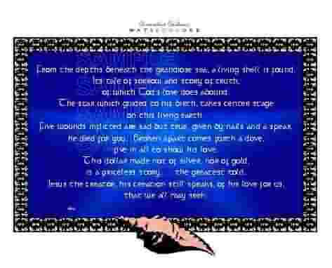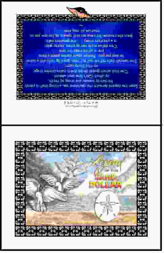 FROM THE DEPTHS BENEATH THE GRANDIOSE SEA, A LIVING SHELL IS FOUND. ITS TALE OF SORROW AND STORY OF TRUTH, OF WHICH GOD'S LOVE DOES ABOUND. THE STAR WHICH GUIDED TO HIS BIRTH, TAKES CENTER STAGE UPON THIS LIVING EARTH. FIVE WOUNDS INFLICTED SAD BUT TRUE, GIVEN BY NAILS AND A SPEAR, HE DIED FOR YOU. BROKEN APART COMES FORTH A DOVE, FIVE IN ALL TO SHOW HIS LOVE. THIS DOLLAR MADE NOT OF SILVER , NOR OF GOLD, IS A PRICELESS STORY . . . THE GREATEST TOLD. JESUS THE CREATOR, HIS CREATION STILL SPEAKS, OF HIS LOVE FOR US, THAT WE ALL MAY SEEK.