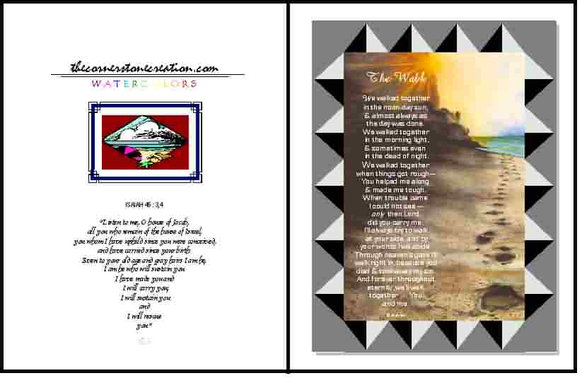 WE WALKED TOGETHER IN THE NOON-DAY SUN, & ALMOST ALWAYS AS THE DAY WAS DONE. WE WALKED TOGETHER IN THE MORNING LIGHT, & SOMETIMES EVEN IN THE DEAD OF NIGHT. WE WALKED TOGETHER WHEN THINGS GOT ROUGH--YOU HELPED ME ALONG AND MADE ME TOUGH. WHEN TROUBLE CAME I COULD NOT SEE--ONLY THEN LORD DID YOU CARRY ME. I'LL ALWAYS TRY TO WALK AT YOUR SIDE, AND BY YOUR WORDS I WILL ABIDE. THROUGH HEAVEN'S GATE I'LL WALK RIGHT IN, BECAUSE YOU DIED & TOOK AWAY MY SIN. AND FOREVER THROUGHOUT ETERNITY, WE'LL WALK TOGETHER . . . YOU AND ME.